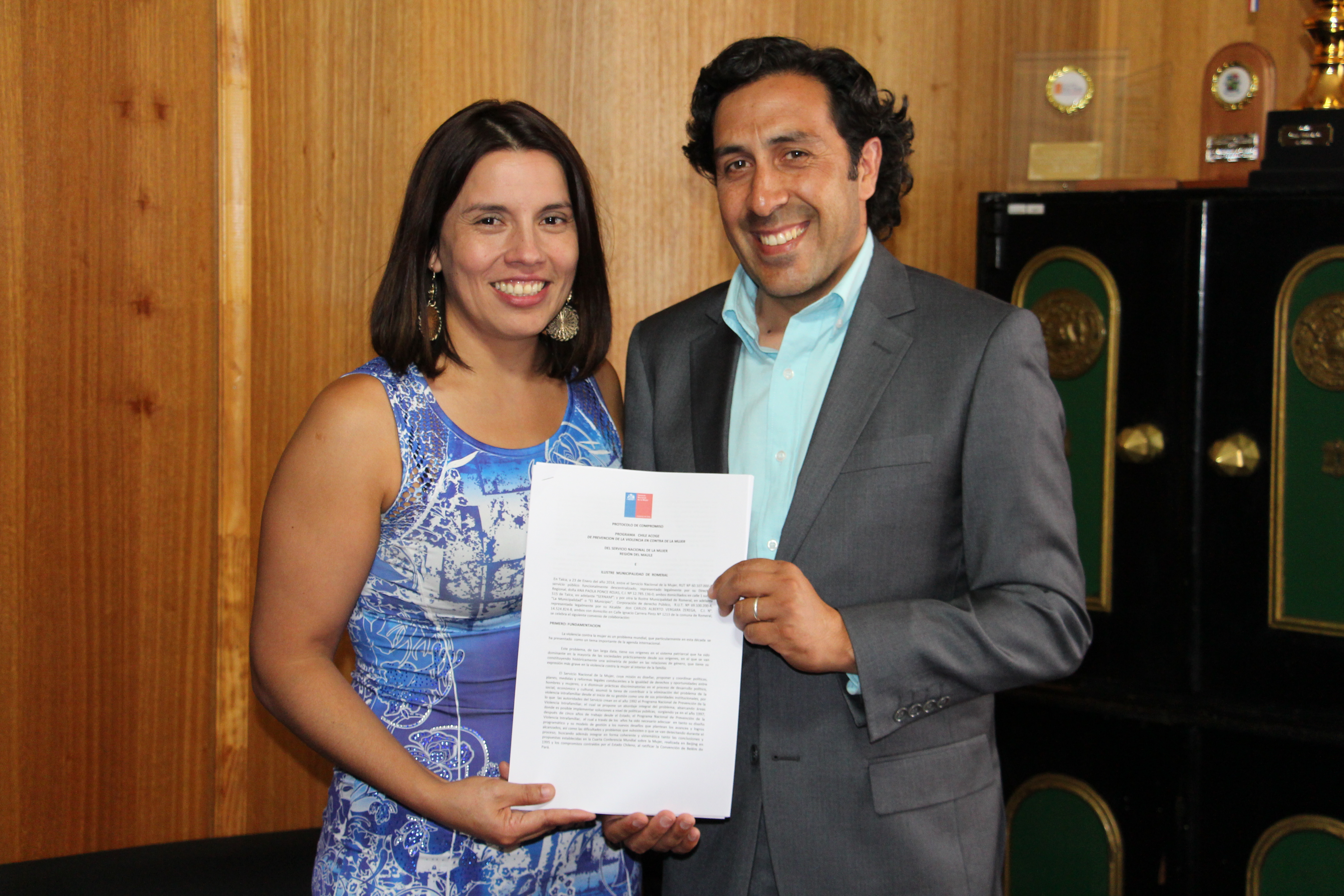 En dependencias de la oficina alcaldicia de la Municipalidad de Romeral, se llevó a cabo un convenio entre el municipio y el Servicio Nacional de la Mujer, representado por el alcalde Carlos Vergara Zerega y la Directora del Sernam, Ana Paola Ponce.